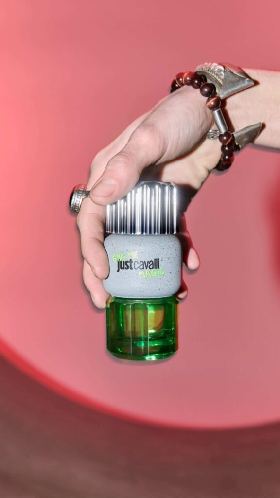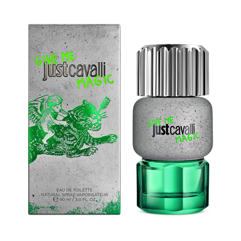 Nadahnut totemskim dizajnerskim konceptom, dizajn dua Just Cavalli Give Me Magic približava se skulpturalnim oblicima i premium dojmu na dodir. Riječ je o senzualnom iskustvu s efektom betonske teksture, masivnim staklom i reljefnim gotičkim detaljima logotipa na čepu, koji se spajaju s moćnim bojama, logotipima u grafiti stilu i čistim linijama za izazovan vizualni dojam. Vanjsko pakiranje prenosi betonski efekt i atraktivnu grafiku bočice, a istovremeno uključuje modne naglaske linije Just Cavalli, poput tigrastog uzorka koji krasi stranice kutije.