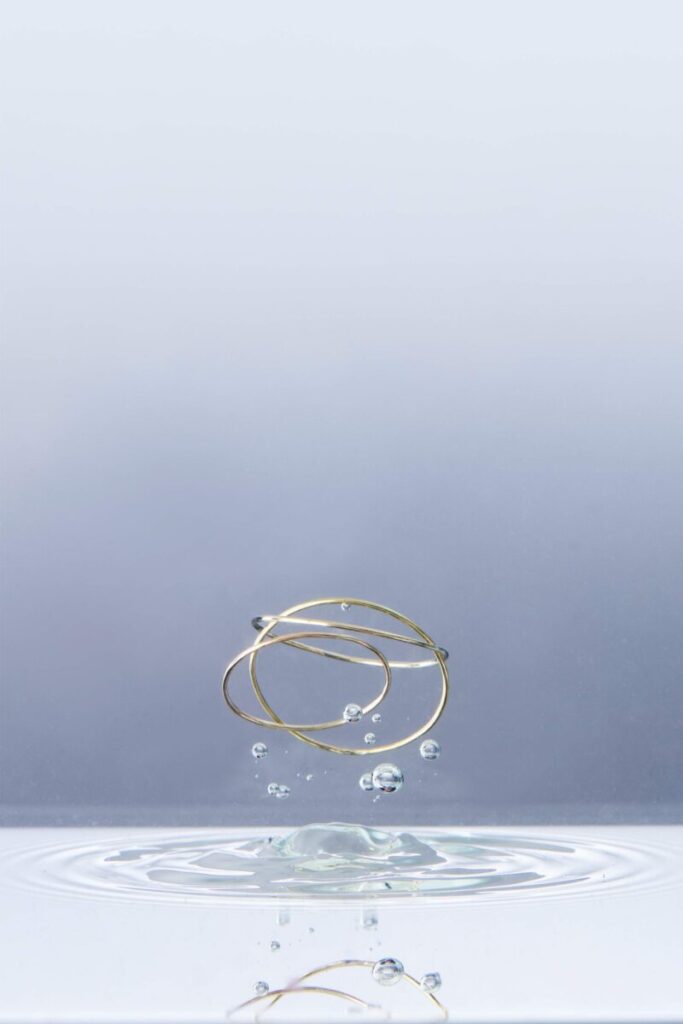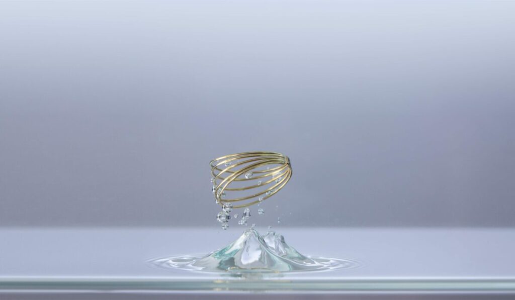 Izložbeni postav čiji je autor Svebor Andrijević, dodatno pojačava dojmljivost kolekcije: nakit je predstavljen u dijalogu s fotografijama i videom Vanje Šolina, gdje zlatne forme izranjaju iz vode i svjetla, prelazeći iz predmetnog u gotovo apstraktni prostor. Monumentalni kadrovi i multimedijalna instalacija unose performativni aspekt, dok minimalističke vitrine od sirovog čelika i vizualni identitet Jelenka Hercoga, temeljen na blago deformiranom krugu, naglašavaju plemenitost materijala i preciznost izvedbe.